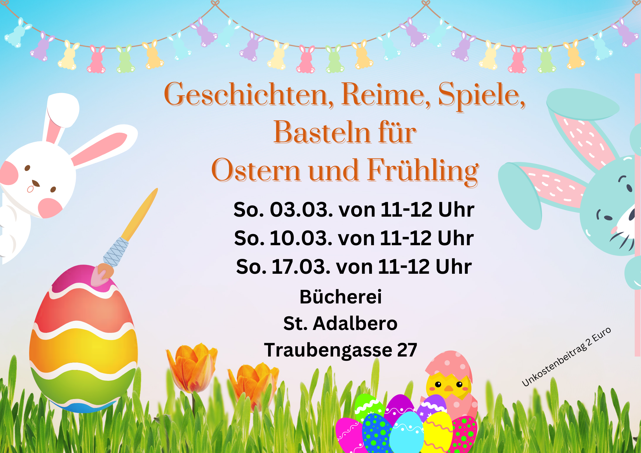 Wir laden Sie ein, am Sonntag, den 3. März, Sonntag, den 10. März und Sonntag, den 17. März. jeweils von 11 bis 12 Uhr in die Bücherei St. Adalbero, Traubengasse 27 zu kommen und diese besondere Zeit des Jahres mit uns zu feiern.