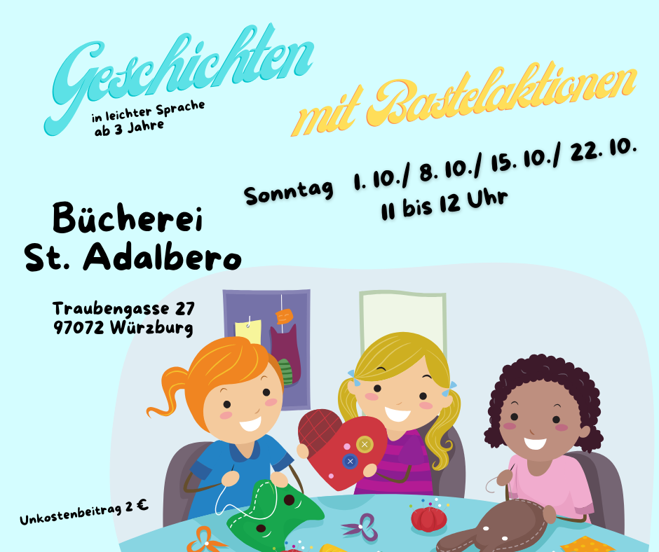Der Sankt Michaelsbund startet gemeinsam mit den Büchereien in Bayern das Projekt "Leichte Sprache", um möglichst vielen Menschen den Zugang zu Informationen zu ermöglichen und Bildungsmöglichkeiten zu erschließen. Unsere Bücherei unterstützt dieses Projekt mit der Aktion "Geschichten mit Bastelaktionen" für Kinder ab 3 Jahre.